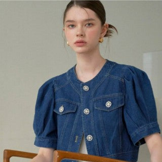 [DK SHOP] Puff Sleeve Cubic Button Cropped Denim Jacket