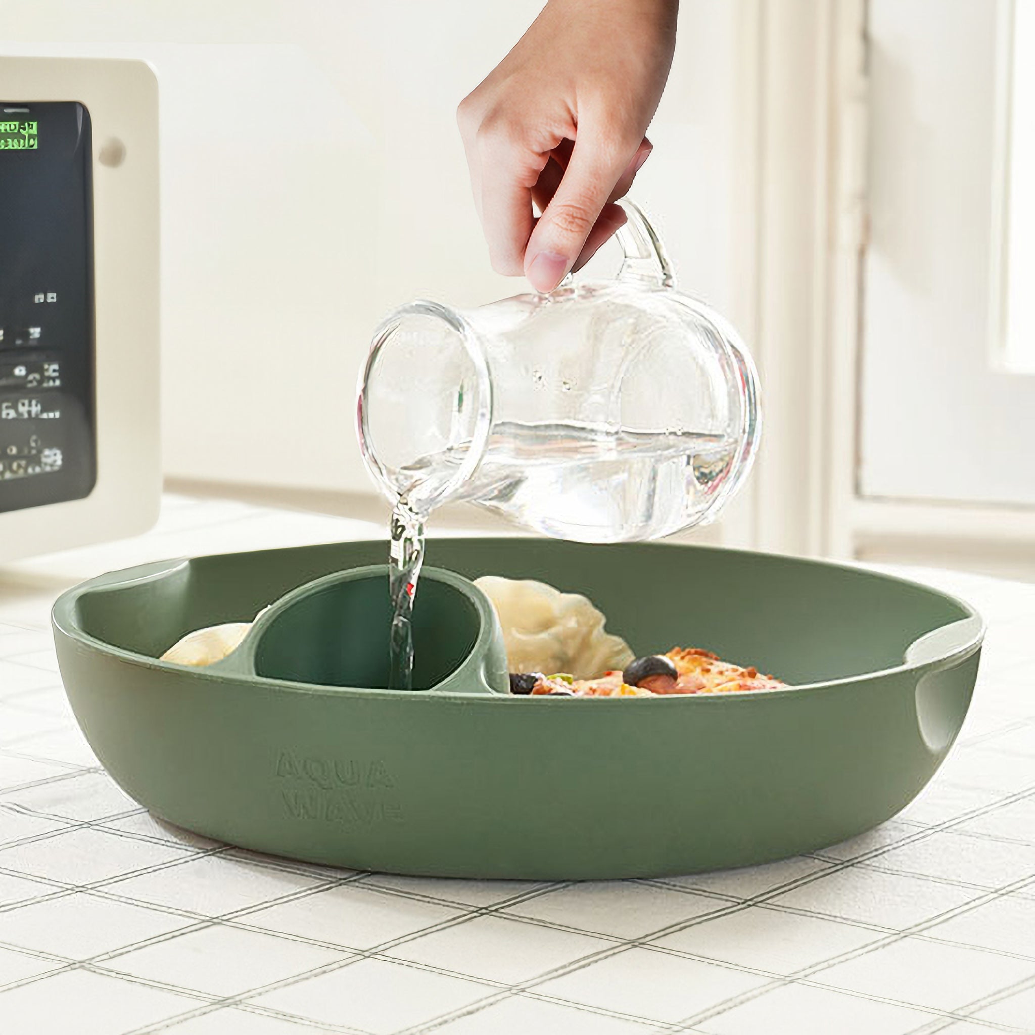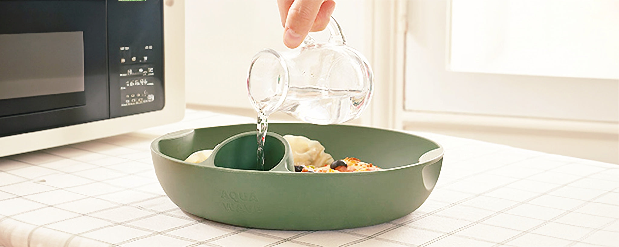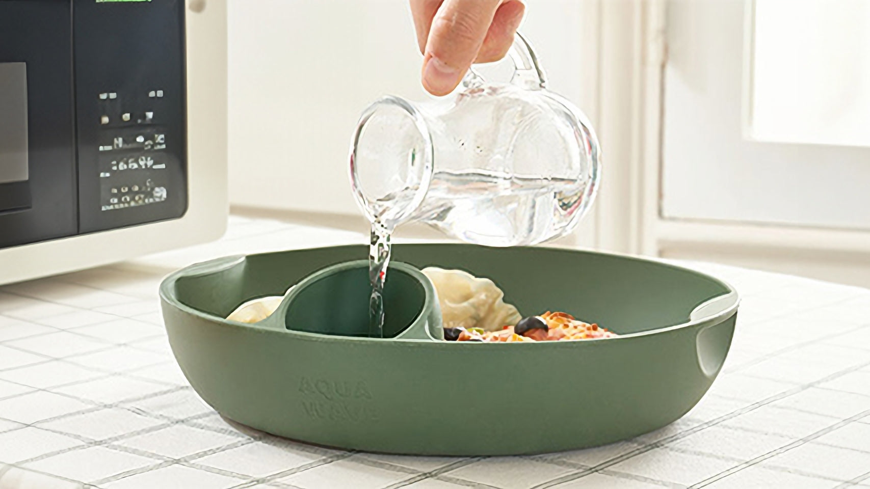 - The water contained in the Aquawave evaporates instead of the moisture within the food, and the steam inside the microwave is absorbed towards the food, keeping it moist.