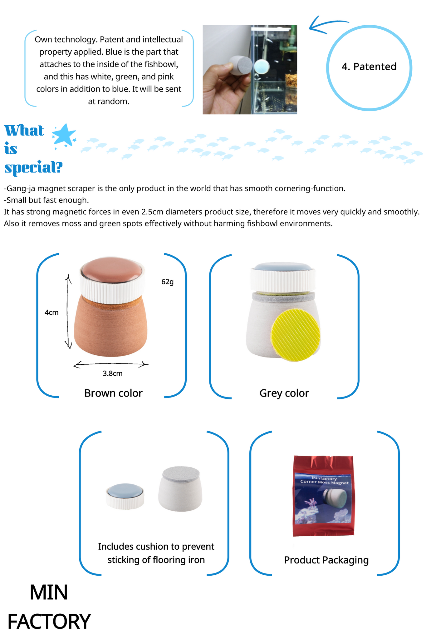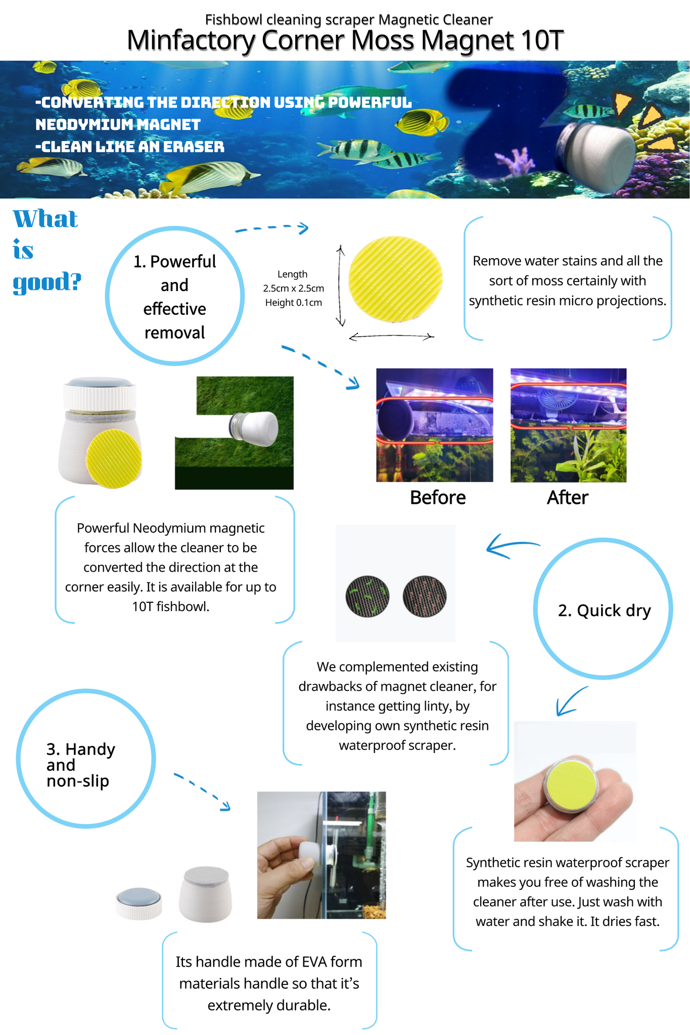 It has strong magnetic forces in even 2.5cm diameters product size, therefore it moves very quickly and smoothly. Also it removes moss and green spots effectively without harming fishbowl environments.