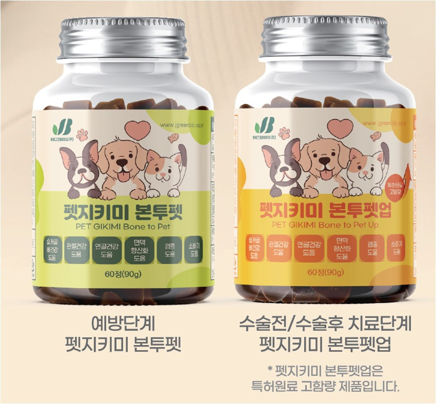 We have developed pet nutritional supplements using university-researched human-grade natural materials, both individually approved and registered, with proven clinical efficacy and safety. Pet GiKiMi Bone to Pet is designed to prevent and care for joint and patellar (kneecap) disorders in companion animals. Compared to existing products, it excels in both taste and effectiveness. Our mission is to research, develop, and commercialize products that safeguard the health of our beloved pets.