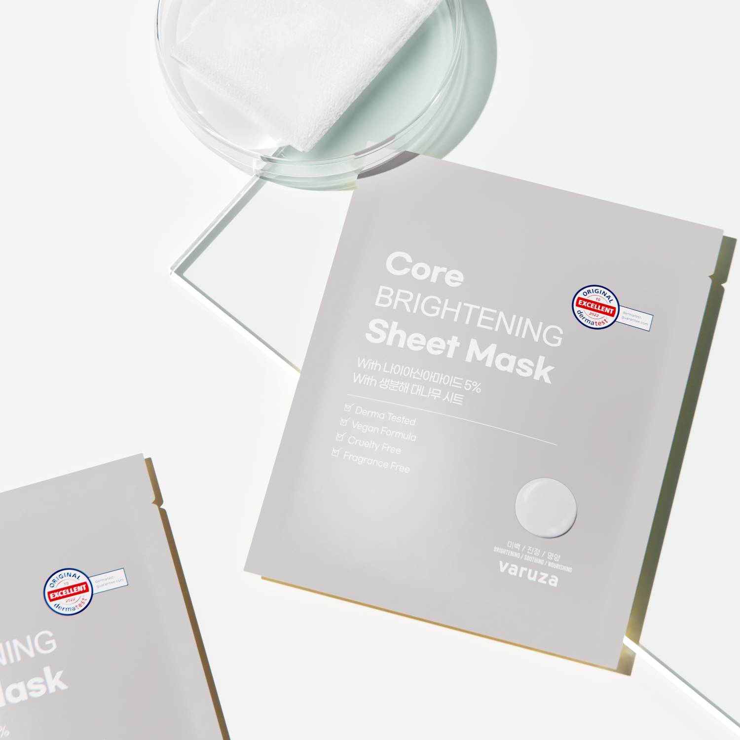 - Core Brightening Sheet Mask: Biodegradable bamboo sheet + light cream serum