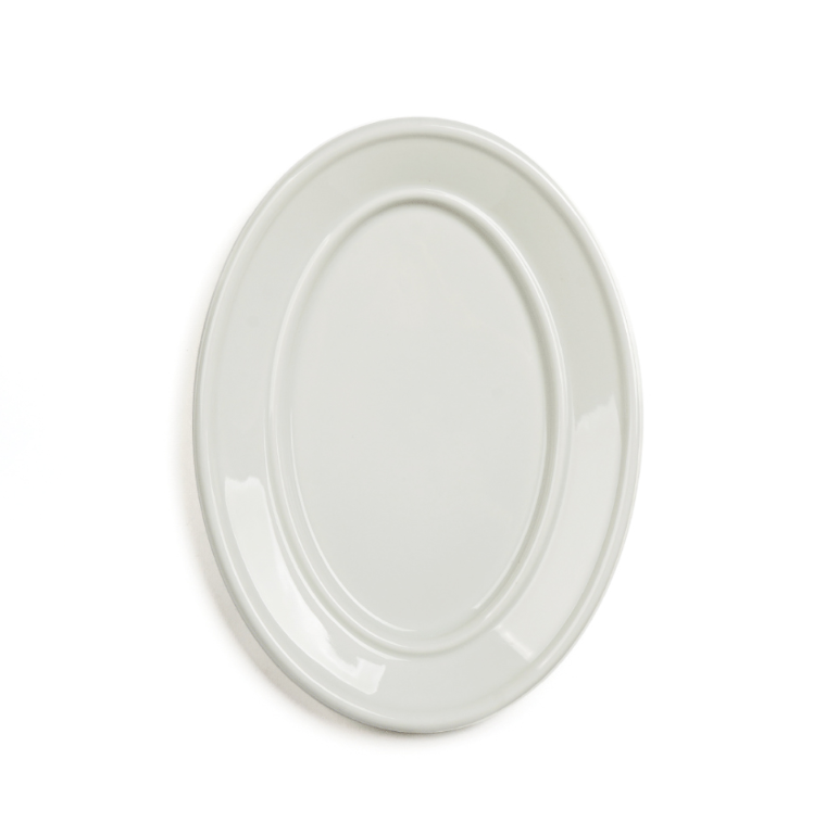 A glossy dish with a harmonious blend of pure white and light blue hues. The ideal size for serving a main dish with refined simplicity.
